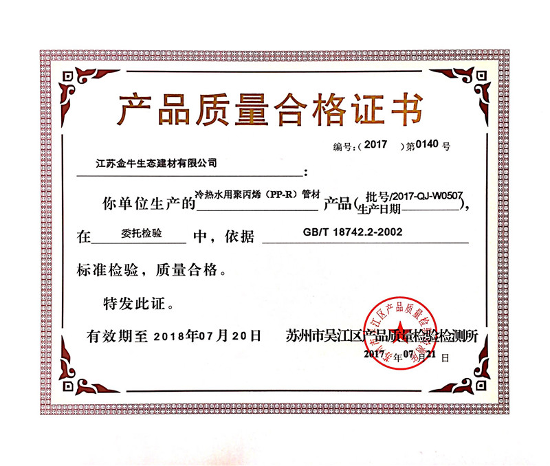 江蘇金牛生態(tài)建材冷熱水用聚丙烯(PP-R)管材產(chǎn)品質(zhì)量合格證書2017